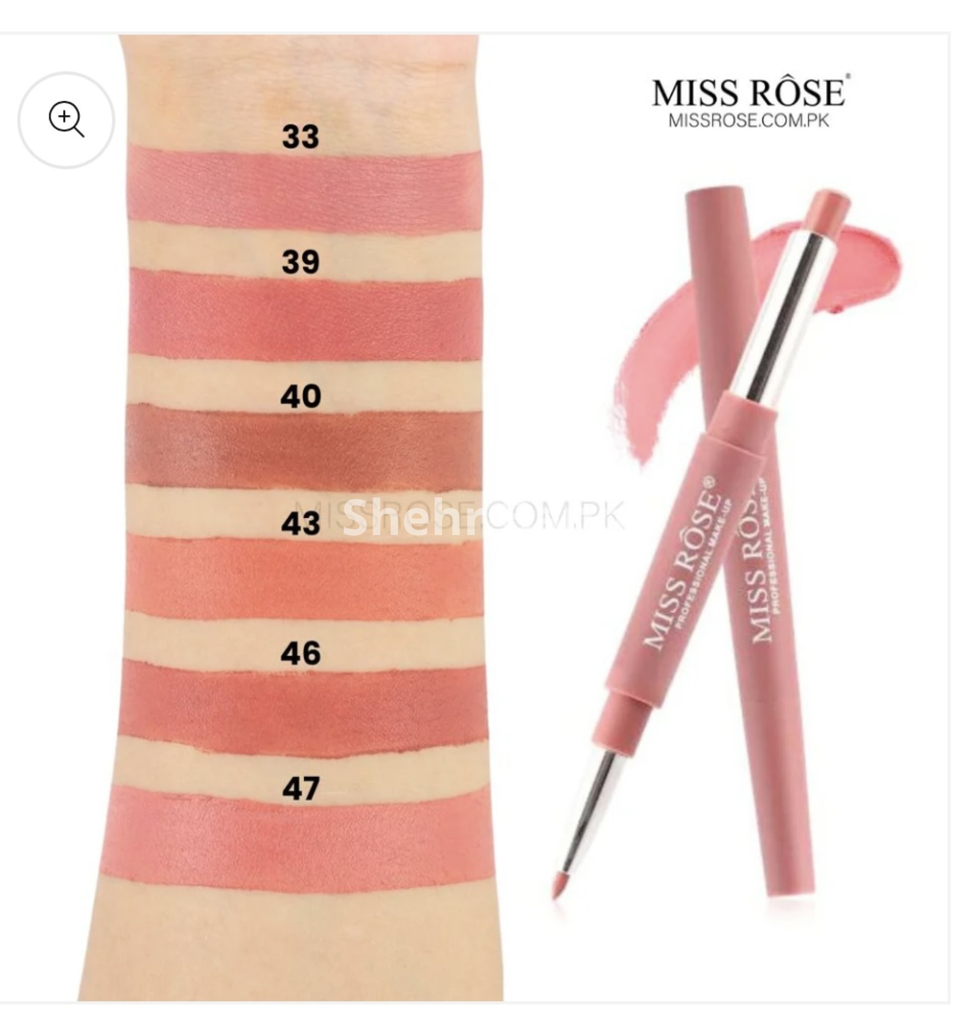 MISS ROSE Double-end Lip Liner and Lipstick is moisturizing waterproof long-lasting Lip Gloss. Miss rose 2 in 1 Double-end, combined lipstick and lip liner helps you easily complete the perfect lip shape. It's a multi-purpose lipstick which can serve as a blusher, an eyeshadow pen and an eyeliner pen for bi-color combination.Get the Look with Colour Rich Lip Liner and Lipstick