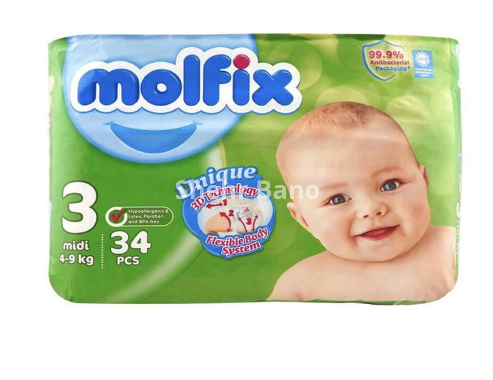 Molfix baby diapers are produced with utmost care, they are tremendously gentle on your baby's sensitive skin, and their green absorbent layer provides perfect dryness while the outer surface of the...